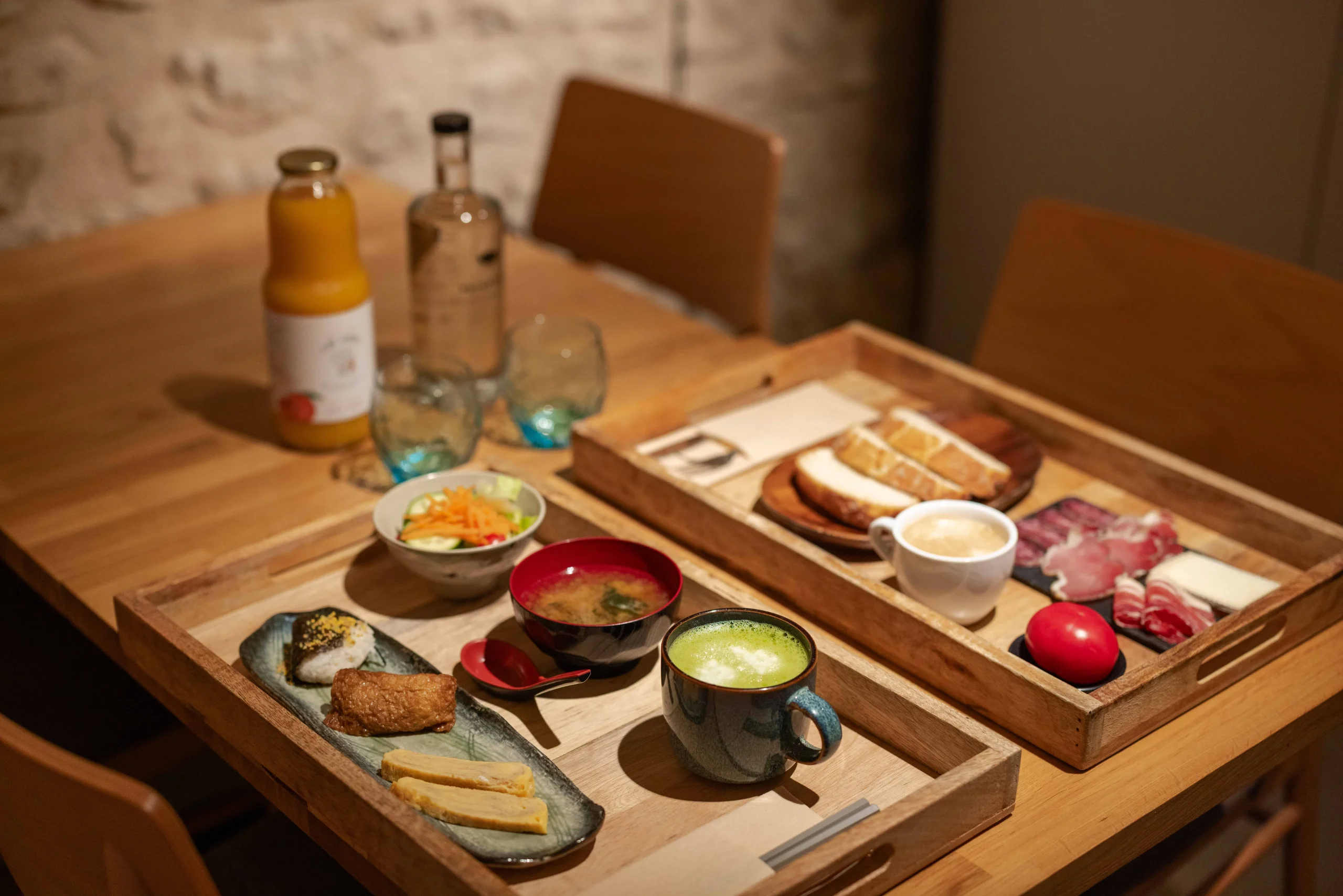 - Esmorzar de cuina japonesa, amb oniguiri de salmó, oinari, sopa de miso amb algues i tofu, amanida fresca amb salsa japonesa i truita dolça.